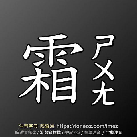 霜,注音ㄕㄨㄤ,拼音shuāng,辭典解釋為:1.接近地面的水蒸氣,遇冷而凝結成的白色結晶細微顆粒。例:床前明月光,疑是地上霜。(唐.李白〈靜夜思〉詩) 2.白色如霜的粉末或膏脂。例:砒霜、面霜、杏仁霜 3.灰白色的。例:霜髮、霜鬢