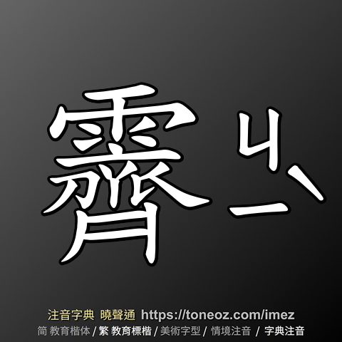 霽,注音ㄐㄧˋ,拼音jì,辭典解釋為:1.雨後或霜雪過後轉晴。例:雪霽、秋雨新霽、大雪初霽 2.明朗的。例:霽月、霽日 3.比喻怒氣消散,臉色轉為和悅。例:色霽