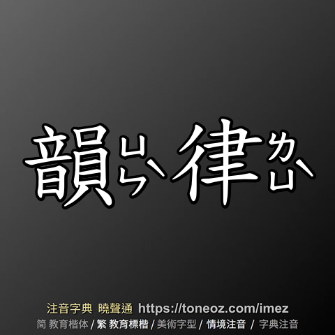 韻律,注音ㄩㄣˋ ㄌㄩˋ,拼音yùn lǜ,辭典解釋為:詩歌或音樂的旋律節奏。例:這首歌歌聲悠揚,韻律和諧,聽起來十分悅耳。