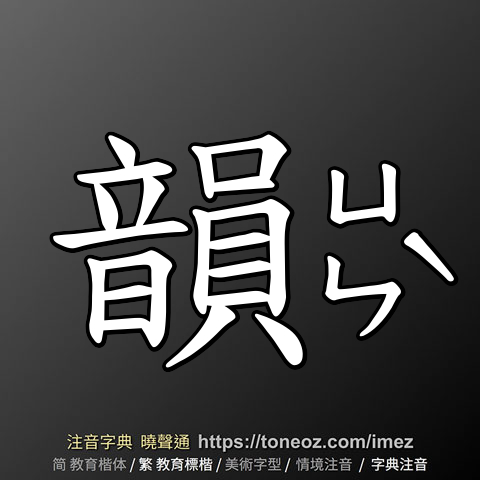 韻,注音ㄩㄣˋ,拼音yùn,辭典解釋為:1.和諧的聲音。例:琴韻、雅韻 2.神態、風度。例:氣韻、神韻、風韻 3.風雅的、風趣的。例:韻事 4.語音學上的元音或母音。例:疊韻、聲韻