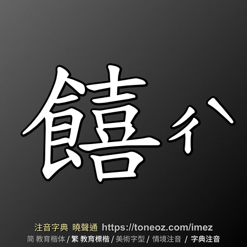 饎,注音ㄒㄧ,拼音xī,辭典解釋為:[名] 酒食。《爾雅.釋訓》:「饎,酒食也。」《詩經.小雅.天保》:「吉蠲為饎,是用孝享。」 [動] 炊煮、煮熟。《儀禮.特牲饋食禮》:「饎爨在西壁。」漢.鄭玄.注:「饎,炊也。」《初刻拍案驚奇》卷六:「攪入一兩樣,不按君臣的藥末,饎起成糕。」