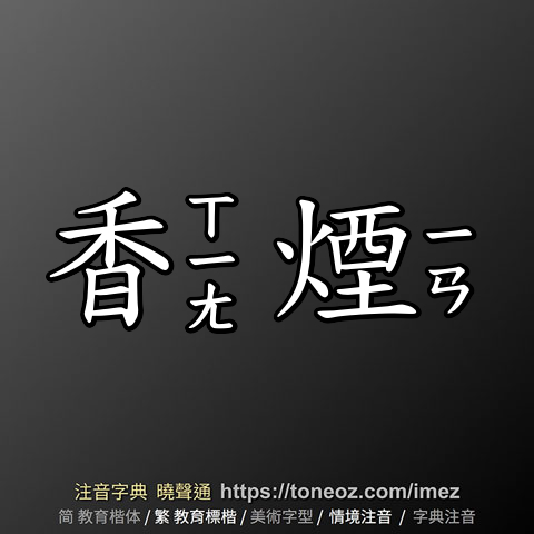 香煙,注音ㄒㄧㄤ ㄧㄢ,拼音xiāng yān,辭典解釋為:1.焚香時所生的煙。唐.杜甫〈奉和賈至舍人早朝大明宮〉詩:「朝罷香煙攜滿袖,詩成珠玉在揮毫。」《西遊記.第三四》:「博山爐裡,靄靄香煙。」 2.比喻後嗣。因祭祖要燃香生煙,故稱子孫祭祖為接續香煙,引申為傳宗接代。《老殘遊記》第一七回:「他若餓死,不但父母無人祭供,並祖上的香煙從此便絕。」 3.用薄紙捲細菸草做成的紙菸。也作「香菸」。