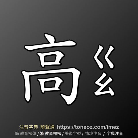 高,注音ㄍㄠ,拼音gāo,辭典解釋為:1.物體上下的長度。例:身高、樓高十丈  2.上下距離遠的,或離地面遠的。與「低」、「矮」相對。例:山高水深、高樓大廈   3.超越一般水準的、等級在上的。例:高價、高級、高手 4.數量大。例:高齡、年高德劭 5.聲音尖銳激昂。例:高歌、高音、高聲 6.高的地方。例:居高臨下、登高望遠 7.姓。