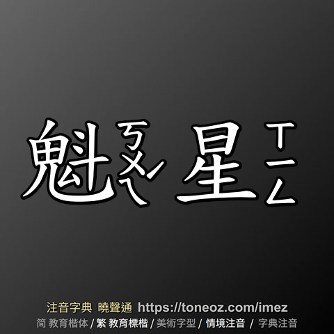 魁星,注音ㄎㄨㄟˊ ㄒㄧㄥ,拼音kuí xīng,辭典解釋為:1.北斗七星中形成斗形的四顆星。一說為其中離斗柄最遠的一顆星。例:將魁星中的天樞、天璇兩星相連的距離延長五倍,即可以找到北極星。 2.神話傳說中掌管文運的神。例:這次研究所考試,他報考三所學校,結果都金榜題名,真是魁星高照。 △奎星