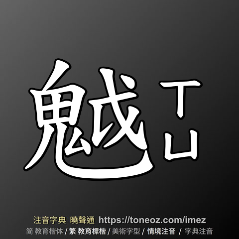 魆,注音ㄒㄩˋ,拼音xù,辭典解釋為:[形] 昏暗的樣子。如:「魆黑」。 [副] 1.猝然、突然。《初刻拍案驚奇》卷二:「應捕魆地跳將出來。」 2.悄悄、暗地。明.葉憲祖《鸞鎞記》第二一齣:「誰家一俊豪,將奴魆地瞧。」明.凌濛初《紅拂記》第一齣:「瞑子裡落空他,魆地裡,追隨你。」
