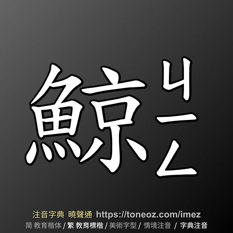 鯨,注音ㄐㄧㄥ,拼音jīng,辭典解釋為:動物名。脊椎動物門哺乳綱鯨目。生活在海洋中,胎生,以哺乳方式育兒,是現今世界上最大的動物。外形像魚,用肺呼吸,鼻孔位於頭頂上,故常露出水面呼吸。為恆溫動物,並具有迴游的習性。