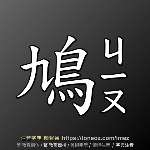 鳩,注音ㄐㄧㄡ,拼音jiū,辭典解釋為:1.鴿形目鳩鴿科部分鳥類的通稱。其狀似鴿,但體型較小,頭小胸凸,尾短翼長。如斑鳩。 2.聚集。例:鳩合、鳩集