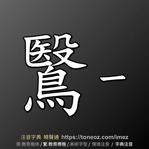 鷖,注音ㄧ,拼音yī,辭典解釋為:[名] 1.一種鷗鳥。明.張自烈《正字通.鳥部》:「鷖,鷗也。蒼黑色,群飛鳴,隨潮往來,曰信鳧。知風起,輒飛至岸,渡海者以為候。」《詩經.大雅.鳧鷖》:「鳧鷖在涇,公尸來燕來寧。」 2.鳳凰的別名。《楚辭.屈原.離騷》:「駟玉虯以椉鷖兮,溘埃風余上征。」漢.王逸.注:「鷖,鳳皇別名也。」 [形] 青黑色。《周禮.春官.巾車》:「厭翟,勒面繢𦇎;安車,彫面鷖𦇎。」