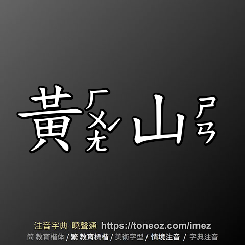 黃山,注音ㄏㄨㄤˊ ㄕㄢ,拼音huáng shān,辭典解釋為:1.山脈名。位於安徽省歙縣西北六十里,綿亙於浙省東南及贛東皖南,是青弋江的發源地。諸峰列峙,最著者有三十六峰,以光明頂、蓮花峰、天都峰為三大主峰。最高峰達六千五百尺以上。山上風景絕佳,奇松、怪石、雲海、溫泉合稱「四絕」。是著名的旅遊勝地。 2.山名:(1)位於安徽省合肥縣東。也稱為「龍泉山」。(2)位於江蘇省武進縣西北,孟河之東。(3)位於山東省濟南市西南。為趵突泉的源頭。 3.漢朝的宮室。位今陝西省興平縣西南。《漢書.卷六五.東方朔傳》:「初建元三年,微行始出,北至池陽,西至黃山,南獵長楊,東遊宜春,微行常用飲酎已。」
