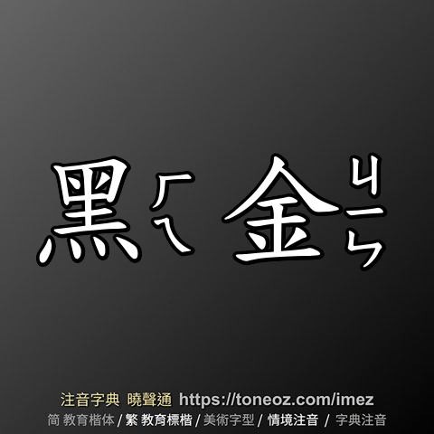 黑金,注音ㄏㄟ ㄐㄧㄣ,拼音hēi jīn,辭典解釋為:1.鐵的別名。 2.煤的俗稱。 3.石油的俗稱。