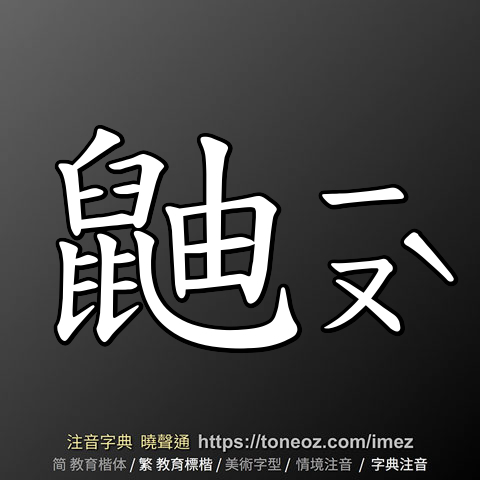 鼬,注音ㄧㄡˋ,拼音yòu,辭典解釋為:食肉目貂科鼬屬動物的總稱。體型大小不一,嗅覺、視覺靈敏,動作迅捷。身體細長,足短,適合進出石隙、洞穴等處。晝伏夜出,以鼠類、松鼠等為食。適應力強,梟類為其主要天敵。