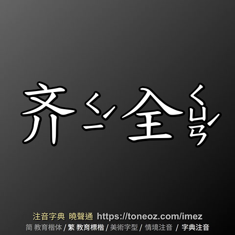 辭典解釋為:全,1.完整、完備。例:十全、齊全、文武雙全 2.整個、全體。例:全家、全神貫注、全軍覆沒 3.保持完好。例:苟全、全身而退 4.完全、都。表示範圍。例:全自動化、全無音訊 5.姓。...