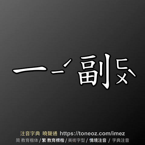 一副,注音ㄧ ㄈㄨˋ,拼音yī fù,辭典解釋為:1.數量詞:(1)物一組。《水滸傳》第三回:「史進便入茶坊裡來,揀一副座位坐了。」(2)物成雙。《老殘遊記》第五回:「看這于家死的實在可慘,又平白的受了人家一副金鐲子,心裡也有點過不去。」 2.形容人臉上的表情。《儒林外史》第二回:「外邊走進一個人來,兩隻紅眼邊,一副鍋鐵臉。」 3.某種文體、言語。《紅樓夢》第六八回:「鳳姐見他母子這般,也再難往前施展了,只得又轉過一副形容言談來,與尤氏反陪禮。」