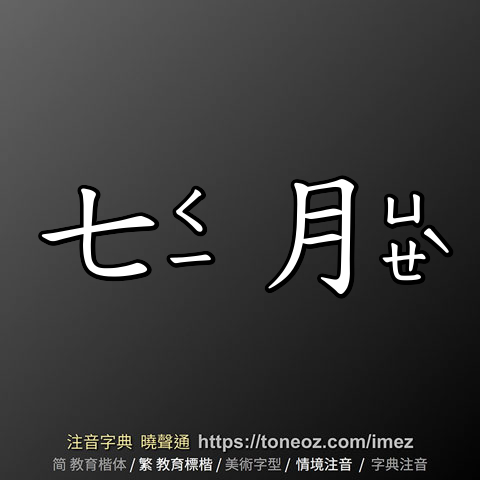 七月,注音ㄑㄧ ㄩㄝˋ,拼音qī yuè,辭典解釋為:《詩經.豳風》的篇名。共八章。根據〈詩序〉:「七月,陳王業也。」或亦指詠豳地風土之詩。首章二句為:「七月流火,九月授衣。」