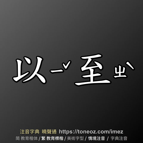 以至,注音ㄧˇ ㄓˋ,拼音yǐ zhì,辭典解釋為:1.一直到。《文選.李陵.答蘇武書》:「自從初降,以至今日。」晉.杜預〈春秋左氏傳序〉:「先儒以為制作三年,文成致麟,既已妖妄,又引經以至仲尼卒,亦又近誣。」 2.導致。《文選.丘遲.與陳伯之書》:「沉迷猖獗,以至於此。」《文選.陳琳.檄吳將校部曲文》:「忽朝陽之安,甘折苕之末,日忘一日,以至覆沒。」