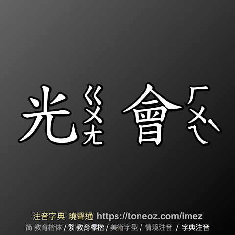 辭典解釋為:光,1.能由視覺器官接收,使人察覺物體存在的電磁輻射。例:日光、燈光 2.明亮。例:光亮、光天化日 3.時間。例:時光、光陰、流光 4.景色。例:風光、觀光、春光明媚 5.榮耀、名譽。例:為國爭光 6.裸露。例:光著身子、光著腳丫子 7.完、盡。例:吃光、用光、花光 8.僅、只。例:光說不做 9.客氣話。用於對別人的恩惠、好處或來臨。例:叨光、光臨、光陪...