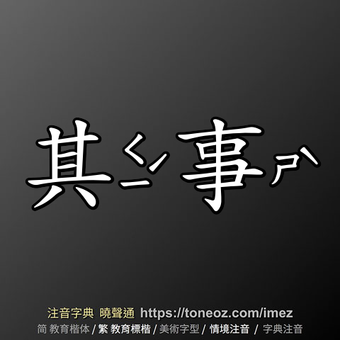 辭典解釋為:其,1.他的、他們的。例:各得其所、人盡其才、聽其自然 2.這個、那樣。表示指示。例:其中、不厭其煩、查無其事 3.豈、難道。例:欲加之罪,其無辭乎?《左傳.僖公十年》) 4.助詞。例:言念君子,溫其如玉。(《詩經.秦風.小戎》)...