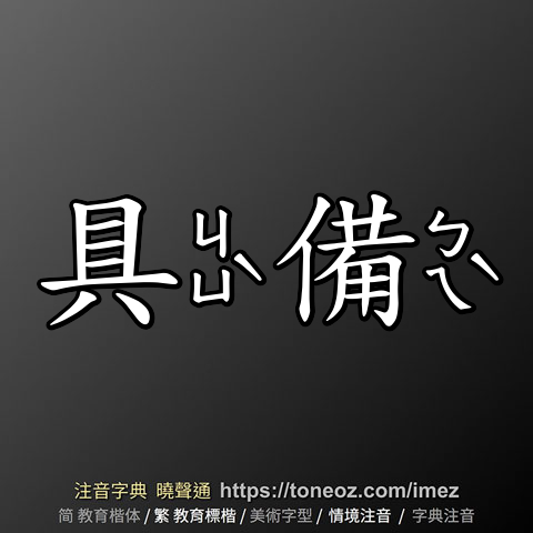 具備,注音ㄐㄩˋ ㄅㄟˋ,拼音jù bèi,辭典解釋為:具有。例:耐心與愛心是從事教學工作應具備的條件。