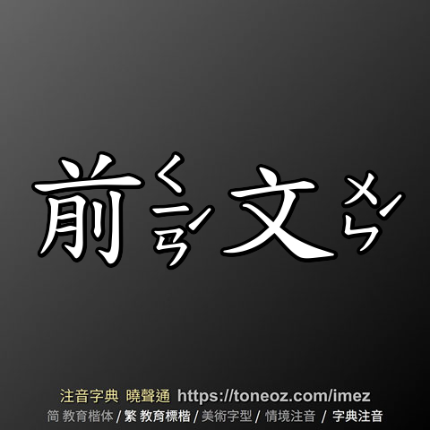 辭典解釋為:前,1.位置在正面或靠近開頭的。與「後」相對。例:前門、前方、面前 2.時間或次序較早的。與「後」相對。例:前天、前三名、史無前例 3.已成為歷史的。例:前清、前蘇聯、前亞東關係協會 4.前任的簡稱。例:前妻、前總理 5.未來的。例:前程、前途、前景看好 6.向正面行進。例:勇往直前、畏縮不前...