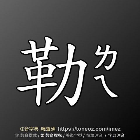 勒,注音ㄌㄜˋ,拼音lè,辭典解釋為:1.有嚼口的馬絡頭。例:黃金勒 2.駕御。例:勒馬長城 3.使停止。例:懸崖勒馬 4.強制、強迫。例:勒令、勒索 5.刻寫。例:勒石、勒碑