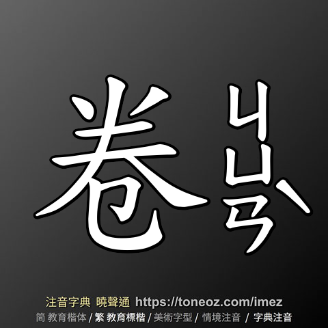 卷,注音ㄐㄩㄢˋ,拼音juàn,辭典解釋為:1.古時書籍寫在竹簡、絹帛或紙上,捲起來收藏,因此通稱書籍為「卷」。例:手不釋卷 、開卷有益 2.書籍的分篇。例:卷一、卷上 3.可以捲起來的書、畫。例:經卷、手卷、畫卷 4.公私機構的文件。例:卷宗、案卷、文卷 5.考試測驗的題紙。例:試卷、考卷 6.量詞。計算字畫書籍的單位。例:藏書三萬卷
