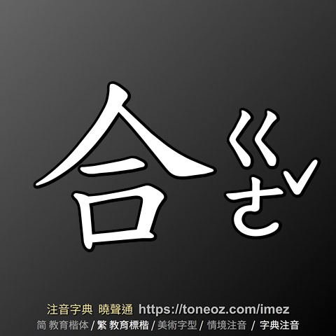 辭典解釋為:合,1.將離散的部分聚集在一起。與「分」相對。例:集合、聚合 2.關閉。例:合眼、合不上嘴 3.全部、整個。例:合家平安、合鄉稱頌 4.相符、不違背。例:合法、合身、合意 5.折算。例:五臺斤合三公斤。 6.應該、應當。例:合該 7.交配、交媾。例:交合、媾合 8.共同、一起。例:合抱、合力、合唱 9.和諧、融洽。例:百年好合 10. 配偶。例:天作之合...