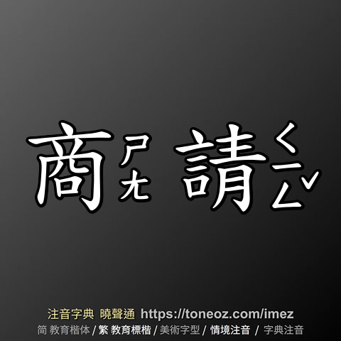 辭典解釋為:商,1.做生意的人。例:布商、米商 2.生意事業。例:經商、習商 3.討論、估計。例:商洽、商酌、商量 4.古時五音之一。音調清勁而淒愴。與「宮」、「角」、「徵」、「羽」合稱五音。 5.朝代名。約西元前十六世紀至前十一世紀,商湯滅夏後所建立的國家。建都亳(ㄅㄛˋ)(今河南省商丘縣),經多次遷移後,至盤庚時定都於殷(今河南省安陽小屯村)。傳至紂時被周武王所滅。農業、手工業、文字都相當發達。青銅器和甲骨文在世界文化中占有相當重要的地位。 6.某數以他數除之所得的數值。例: 6除以 3的商為2。 7.姓。...