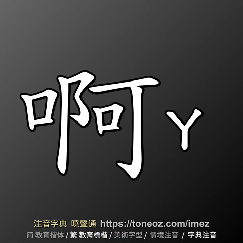 啊,注音ㄚ,拼音ā,辭典解釋為:嘆詞:(1) 表示驚訝、讚嘆的語氣。例:啊!失火了! (2) 表示疑問或反問的語氣。例:啊!你說什麼?