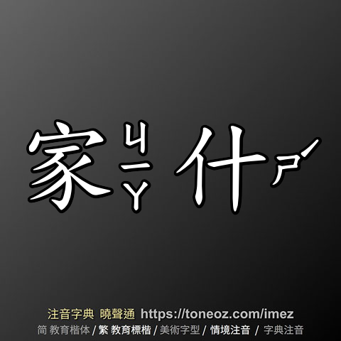 家什,注音ㄐㄧㄚ ㄕˊ,拼音jiā shí,辭典解釋為:家庭所用的器具,如沙發、桌椅等類。也作「家具」、「傢俱」。