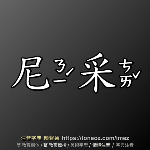 尼采,注音ㄋㄧˊ ㄘㄞˇ,拼音ní cǎi,辭典解釋為:人名。(西元1844~1900)德國哲學家。早年曾攻讀古典文學、神學及叔本華哲學,在哲學思想上,尼采一方面反對宗教、倫理道德,以為只有弱者才會相信;另一方面主張超人,以為權力意志乃人間至高之原理。後精神錯亂,又失明,遂卒。著作甚多,有《超人論》、《善惡彼岸》、《權力意志》、《查拉圖斯特拉如是說》、《悲劇的誕生》、《道德譜系學》等。