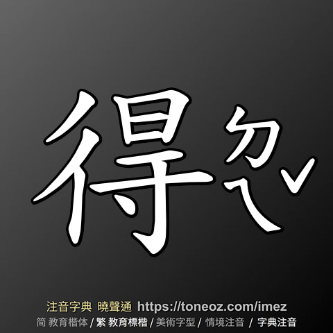 得,注音˙ㄉㄜ,拼音de,辭典解釋為:助詞。用在動詞、形容詞後面,表示結果或性狀。例:跑得快、美得冒泡