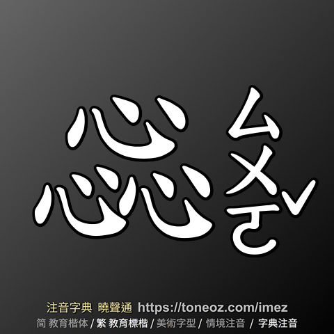 惢,注音ㄙㄨㄛˇ,拼音suǒ,辭典解釋為:[動] 心疑、多慮。《說文解字.心部》:「惢,心疑也。」
