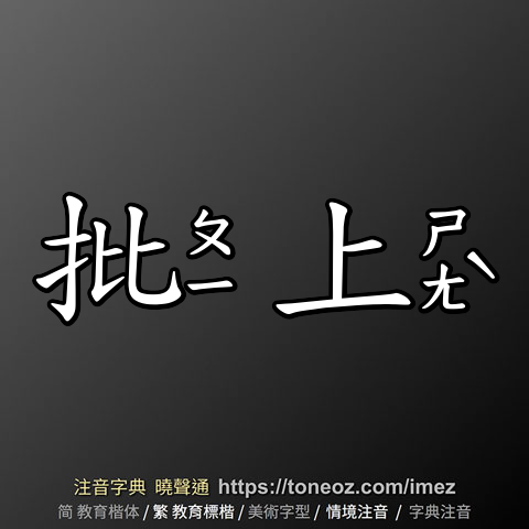辭典解釋為:批,1.用手掌打。例:批頰 2.在文件或文章上直接注明意見和評斷。例:批可、批閱、批准 3.附注在文件或書籍上的評語。例:眉批 4.判斷、評論。例:批評、批判 5.大量買賣。例:批貨、批發 6.用刀橫著或斜著,把物體切成薄片。例:批肉片、批魚片 7.量詞。計算成群的人或物品的單位。例:一批旅客、三大批木材...