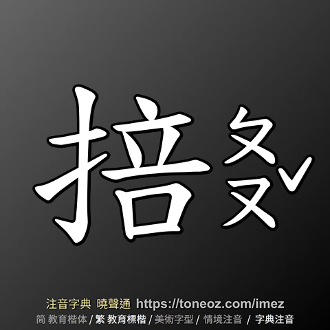 掊,注音ㄆㄡˊ,拼音póu,辭典解釋為:[動] 1.用手或工具挖土。如:「掊坑」、「掊洞」。《新唐書.卷五三.食貨志三》:「大和初,歲旱河涸,掊沙而進,米多耗,抵死甚眾。」 2.聚斂、搜括。《新唐書.卷一二九.嚴挺之傳》:「蜀雖號富饒,而峻掊亟斂,閭里為空。」 [名] 量詞。計算雙手捧取物品的單位。通「抔」。漢.王充《論衡.譋時》:「如泰山失火,沃以一杯之水;河決千里,塞以一掊之土,能勝之乎?」