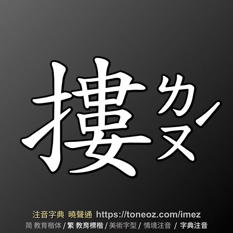 摟,注音ㄌㄡ,拼音lōu,辭典解釋為:1.把散在面前的東西聚攏過來。例:待我把這些散穀子摟一摟。 2.把衣服挽起來。例:他把下襬一摟,擺個金雞獨立的架式。 3.搜括。例:貪官摟財 4.招徠。例:摟攬、摟生意