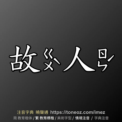 故人,注音ㄍㄨˋ ㄖㄣˊ,拼音gù rén,辭典解釋為:老友。例:故人具雞黍,邀我至田家。(唐.孟浩然〈過故人莊〉詩)