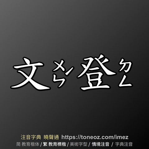 辭典解釋為:文,1.字。例:文字、甲骨文 2.篇章。例:散文、古文、作文 3.非關軍事、戰鬥的。與「武」相對。例:文官、文人 4.禮節、儀式。例:繁文縟節 5.某些有規則的自然現象。例:天文、水文、地文 6.溫和、優雅、不猛烈的。例:溫文、文雅、文火 7.刺染花紋圖案。例:文身 8.量詞。舊時計算銅幣的單位。例:三文錢、分文不取 9.姓。...