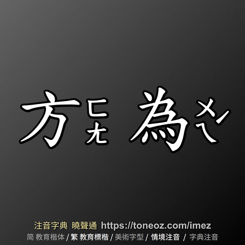 辭典解釋為:方,1.四邊形的四個角皆成90度的形體。例:正方、長方 2.方形的。例:方桌、方塊 3.地理位置或方位。例:遠方、南方、四面八方 4.指相對或並列的人或事物中的一方。例:對方、控方、軍方 5.某一地區的。例:方言、方音 6.法子、辦法。例:方法、千方百計、教導有方 7.才、始。例:書到用時方恨少 8.治病的藥單、配藥的單子。例:藥方、偏方、祕方 9.數學上的乘方。例:平方、立方 10.量詞。計算方形物品的單位。相當於「塊」、「個」。例:匾額一方、一方手帕、三方圖章 11.姓。...