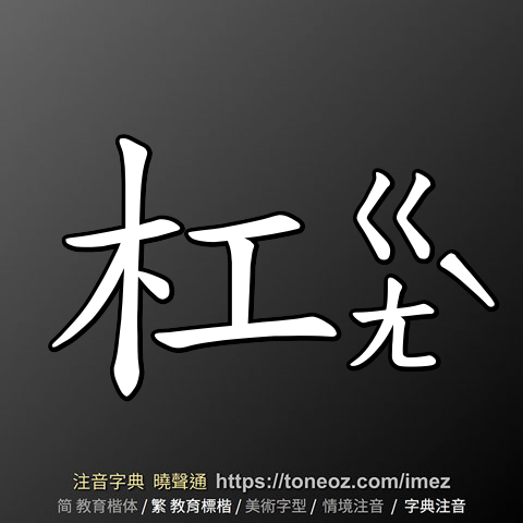 杠,注音ㄍㄤ,拼音gāng,辭典解釋為:[名] 1.旗竿。《集韻.平聲.江韻》:「杠,旌旗干。」《儀禮.士喪禮》:「竹杠長三尺,置于宇西階上。」唐.韓愈〈病中贈張十八〉詩:「牛羊滿田野,解旆束空杠。」 2.小橋。《文選.左思.魏都賦》:「石杠飛梁,出控漳渠。」李善注引郭璞曰:「石杠謂石橋。」