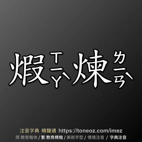 辭典解釋為:煆,[名] 火氣、熱氣。唐.柳宗元〈同劉二十八院長述舊言懷感時書事奉寄澧州張員外使君五十二韻之作因其韻增至八十通贈二君子〉詩:「瘴氛恆積潤,訛火亟生煆。」...
