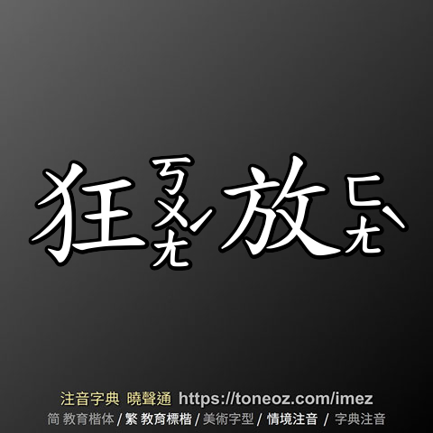 狂放,注音ㄎㄨㄤˊ ㄈㄤˋ,拼音kuáng fàng,辭典解釋為:狂傲放縱,任性而為。如:「他恃才傲物,性格狂放,使人不敢親近。」