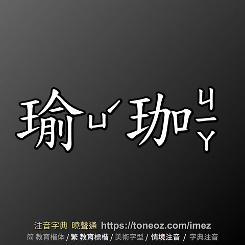 辭典解釋為:瑜珈,英English: variant of 瑜伽[yu2 jia1], yoga...
