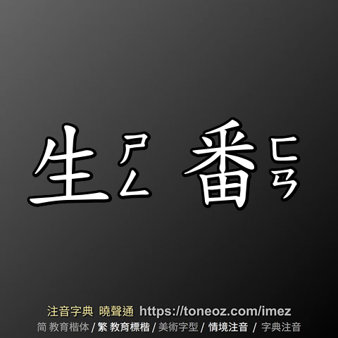 生番,注音ㄕㄥ ㄈㄢ,拼音shēng fān,辭典解釋為:1.舊時指文明發展程度上,處於較原始狀態的民族。《儒林外史》第三九回:「過了半年,松藩衛邊外生番與內地民人互市,因買賣不公,彼此吵鬧起來。」《清史稿.卷八.聖祖本紀三》:「四川威州龍溪十八寨生番歸化納糧。」《二十年目睹之怪現狀》第四七回:「他說要開拓生番的地方,到底不知開拓了多少?」