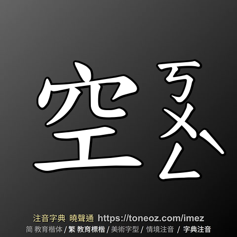 空,注音ㄎㄨㄥ,拼音kōng,辭典解釋為:1.內容虛無所有的狀態。與「滿」相對。例:空屋、撲空、買空 2.不切實際的。例:空言、空論 3.廣闊、高曠。例:海闊天空 4.徒然、白白的。例:原來是在做夢,害我空歡喜一場。 5.天、天際。例:高空、晴空、領空 6.佛教認為一切事物的現象都有各自的因緣,並無實體的概念。例:萬法皆空