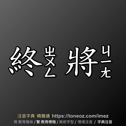 辭典解釋為:終,1.時間處於最後的、結束的部分。指事情的末端。與「始」相對。例:年終、終點、有始有終 2.從開始到末了一整段時間的。例:終年、終日、終生 3.結束、完畢。例:曲終人散、樂曲終了 4.死亡。例:送終、善終、無疾而終 5.到底、畢竟。例:終究、終將結束...