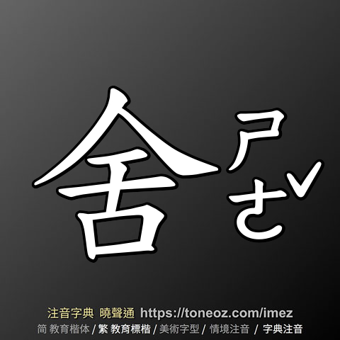 舍,注音ㄕㄜˋ,拼音shè,辭典解釋為:1.房屋、住所。例:宿舍、房舍、寒舍 2.飼養牲畜的地方。例:豬舍、牛舍 3.對人謙稱自己卑幼的親屬或親戚。例:舍弟、舍妹、舍親 4.量詞。古代計算行軍里數的單位。三十里為一舍。例:退避三舍