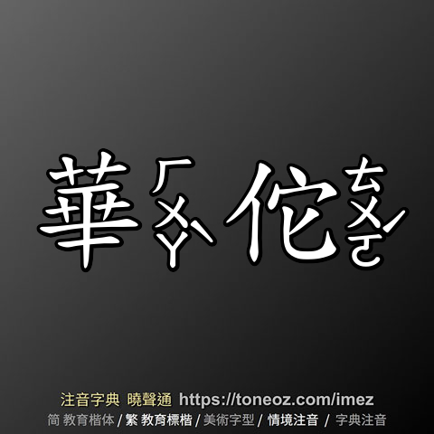 華佗,注音ㄏㄨㄚˋ ㄊㄨㄛˊ,拼音huà tuó,辭典解釋為:人名。(?~西元207)字元化,東漢譙縣(今安徽省亳縣)人。為當時名醫,擅長外科手術,首用麻醉劑為病人開刀治療,並創五禽戲之運動以助養生,後因忤曹操而遭殺害。醫界或以他為行神。也作「華陀」、「華坨」。