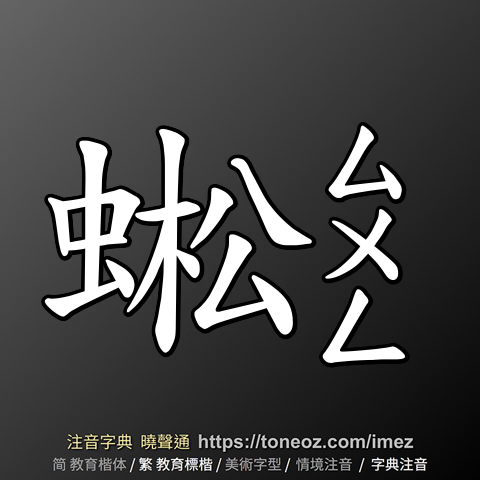 蜙,注音ㄙㄨㄥ,拼音sōng,辭典解釋為:[名] 蜙蝑:動物名。即螽斯。觸角細長,體綠褐色,能發聲,雌者體大,尾端有產卵器。食害農作物。《爾雅.釋蟲》:「蜤螽,蜙蝑。」宋.邢昺.疏:「蜤螽,周南作螽斯,七月作斯螽……一名蜙蝑。」