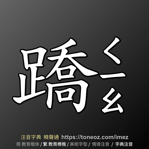 蹻,注音ㄑㄧㄠ,拼音qiāo,辭典解釋為:[動] 抬起腳來。通「蹺」。《說文解字.足部》:「舉足小高也。」