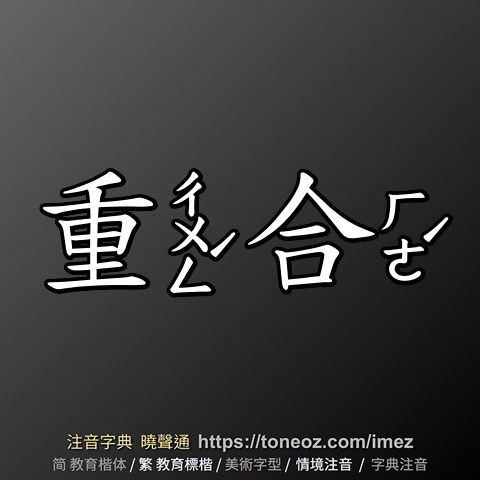 重合,注音ㄔㄨㄥˊ ㄏㄜˊ,拼音chóng hé,辭典解釋為:1.分而復合。 2.凡物體的幾個分子自相結合,而仍為同物質的現象,稱為「重合」。